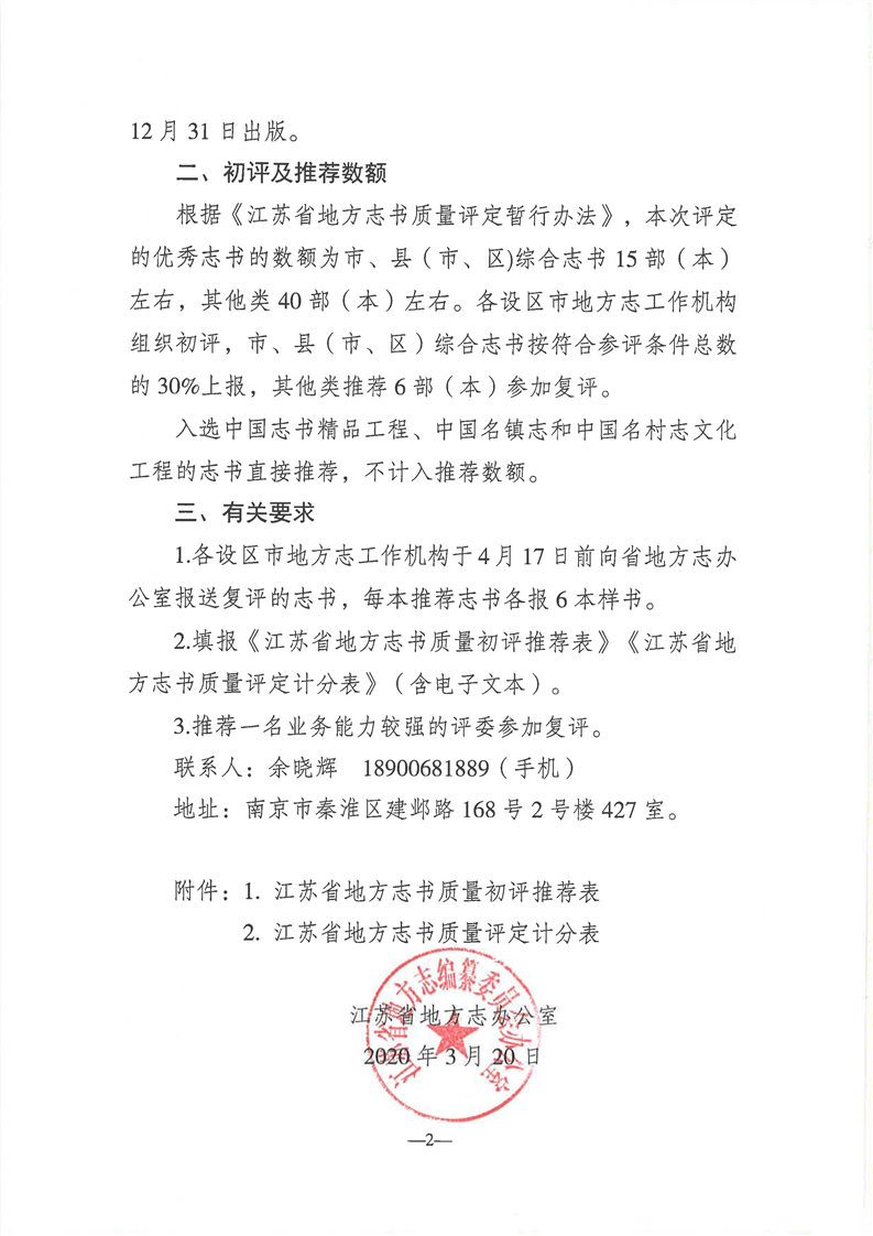 省地方志办公室关于开展2020年地方志书质量评定工作的通知