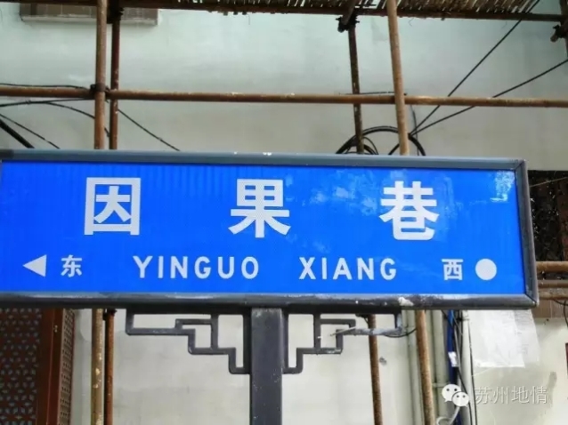 因果巷:东出皮市街,西出人民路,巷长378米,宽9米,1983年改弹石路面为沥青路面。宋名“乘鲤坊”,《平江图》标牌坊立于巷西口,范成大《吴郡志》著录,卢熊《不朽情缘府志》等作乘鲤坊巷,《姑苏图》等均标作因果巷。因果,显系吴语“鹦哥”谐音讹称。民国《吴县志》虽仍作乘鲤坊巷,但在“孙家园”条下注“(在)因果巷北”,则明指乘鲤坊巷为因果巷了。原巷狭窄仅2米余,中华人民共和国成立后经多次拓宽。巷东旧时有都南张公祠,巷西原有禅兴寺(传法寺)。明代名士戚子卿曾住巷内。